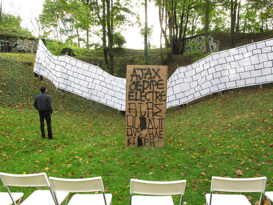 Worshop organisé avec Gwenaël Morin et Alexandre de Dardel pour les étudiants scénographes et concepteurs lumière de la promotion 74. Monter trois textes de Sophocle en trois mois : Ajax, Oedipe et Électre. Trouver des lieux dans le 5ème arrondissement de Lyon, des lieux publics où la représentation théâtrale n'est pas attendue.